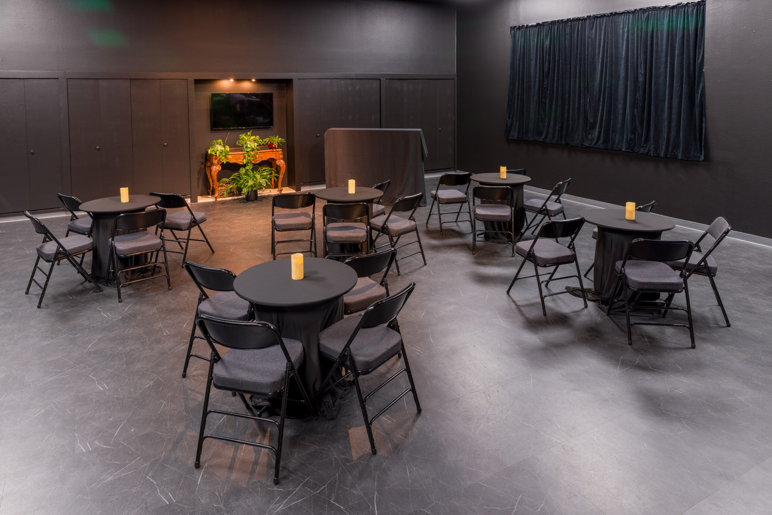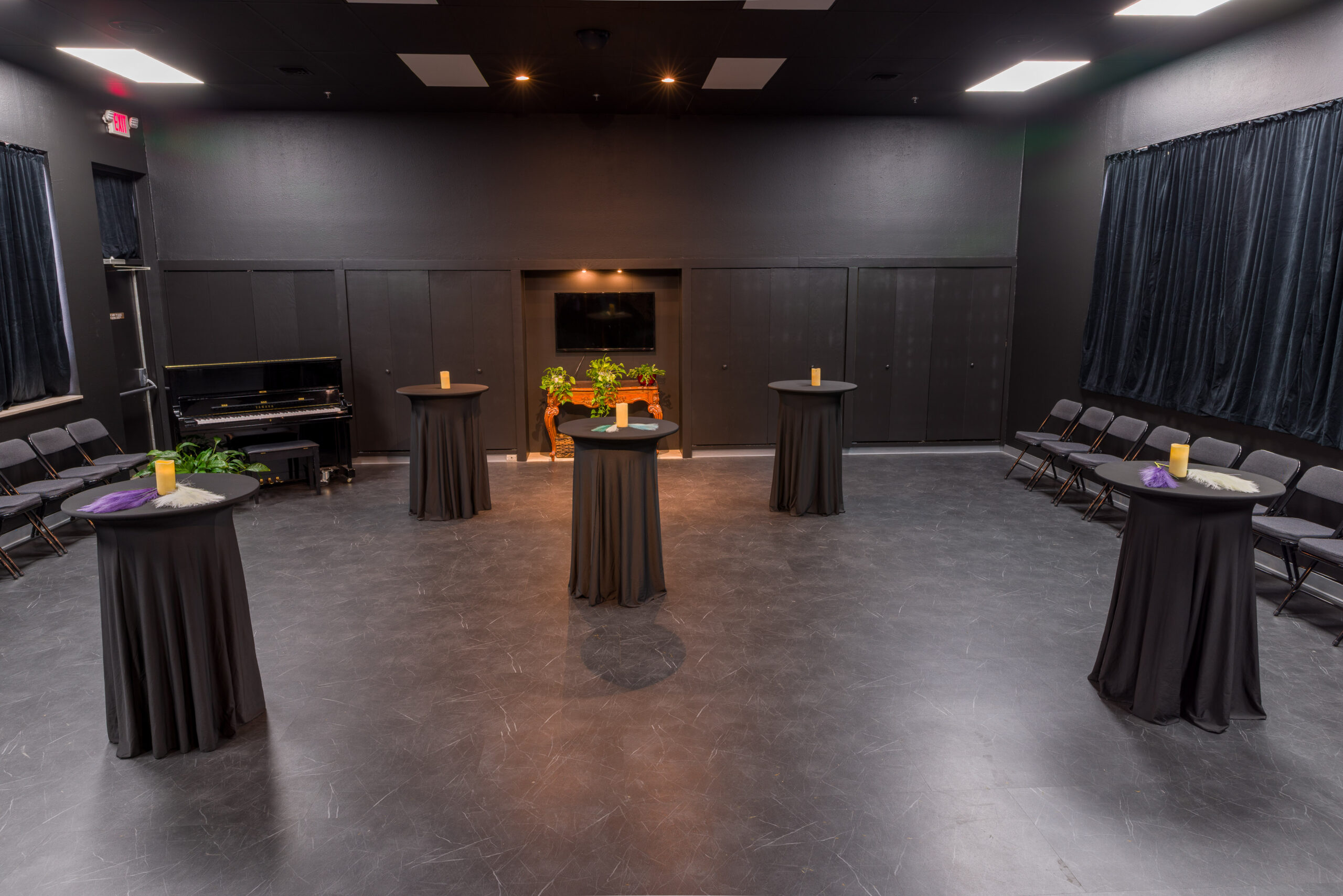 Six 6-foot tables, three 8-foot tables, ten tall/short round-tops, 100 folding chairs, white tablecloths for long tables, black tablecloths for round tables, audio-visual equipment, wi-fi, and theatrical lighting are also available.