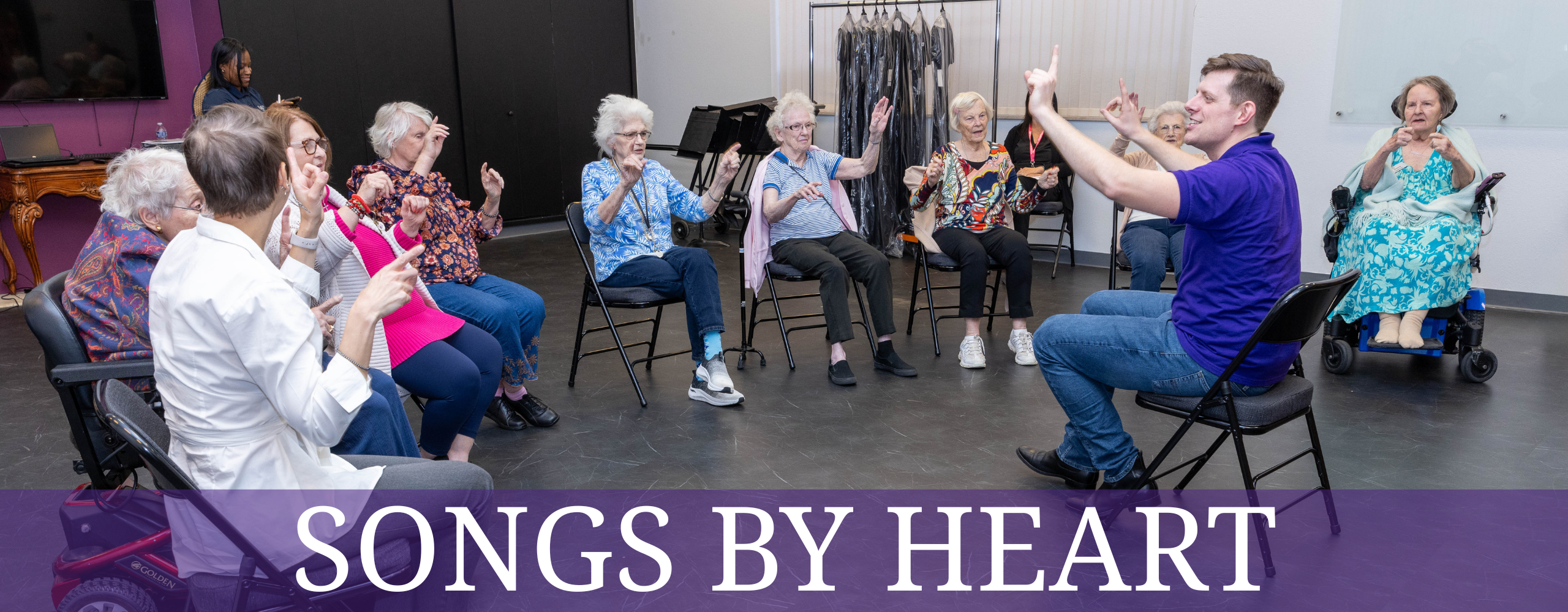 Songs by Heart is an engagement-centered program developed for Memory Care Communities in which a professional level singer leads an interactive sing-along. The singers use therapeutic techniques such as mirroring, verbal and gestural promptings, making direct eye contact, and holding hands with residents throughout the program. Singers encourage residents to join in the singing, clapping, and dancing, as well as engage in conversations centered around the musical selections.